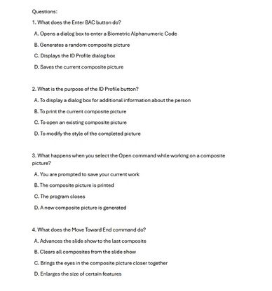 EducationMax access to a selection of tests to be used in the classroom and for students to become FACES 4.0 Certified Police Sketch Artist. The test provided are multiple choice, true and false and open ended. Teaches will need to contact EducationMax to request the tests. A sample is provided in the Testing Materials section.